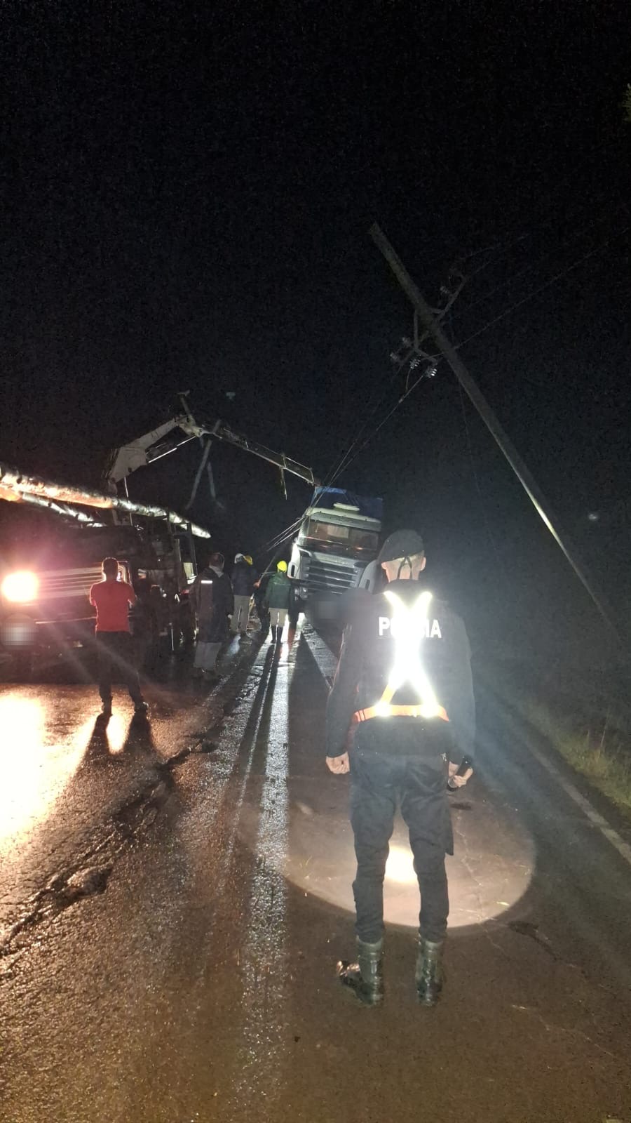 Un camión Scania impactó contra un poste de alta tensión caído sobre la ruta, provocando daños materiales y el corte del suministro eléctrico en una amplia zona de 25 de Mayo. No hubo personas lesionadas.