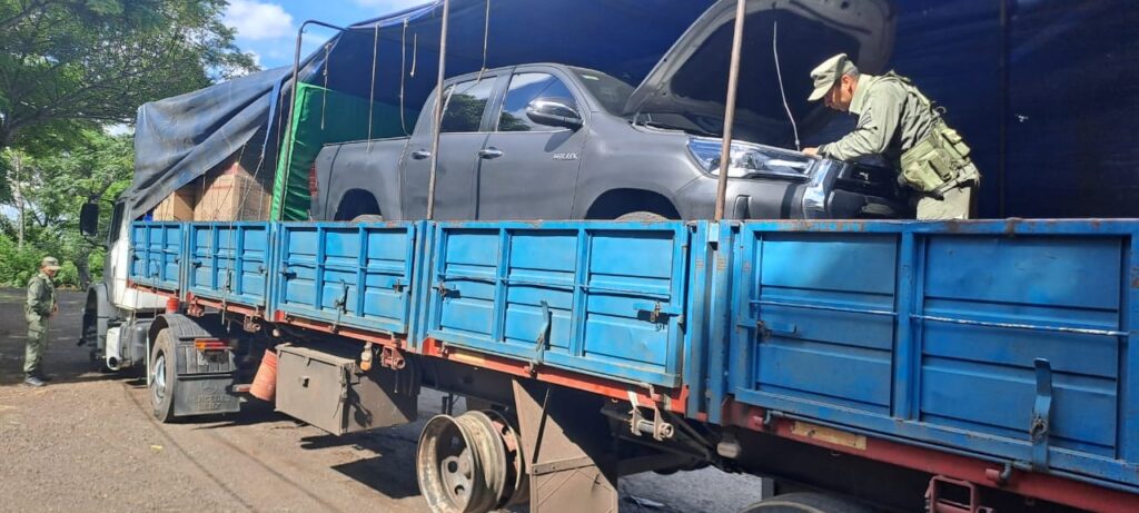 Durante el control físico del transporte, los uniformados constataron que en el semirremolque era transportada una camioneta, cuya documentación presentaba inconsistencias. Personal de Criminalística y Estudios Forenses se hizo presente en el lugar, constatando que tanto la cédula de identificación del automotor como el dominio colocado eran apócrifos. Asimismo, la consulta sobre sus antecedentes arrojó pedido de secuestro activo por robo.