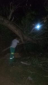 En el sitio trabajaron efectivos de la División Bomberos Zona Oeste, quienes junto a una cuadrilla de Espacios Verdes realizaron cortes sobre el árbol para liberar el vehículo y reducir su tamaño.