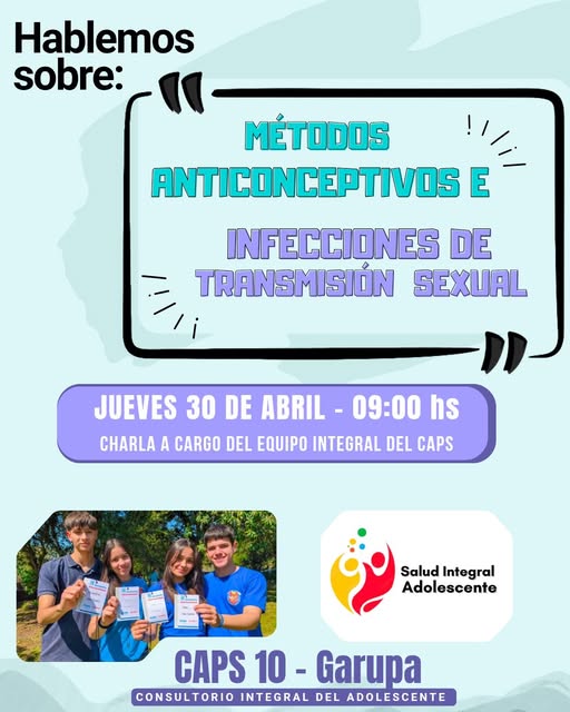 Este jueves, a partir de las 9 horas, el equipo interdisciplinario del consultorio adolescente del CAPS Nº10 de Garupá llevará adelante una charla destinada a jóvenes enfocada en el cuidado de la salud sexual.