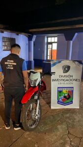 Por último en Alem, la División Investigaciones local recuperó una motocicleta Honda 150 cc, robada a un vecino de 31. Tras tareas investigativas en redes sociales y con información aportada por vecinos, se secuestró el rodado en poder de un menor de 17, quien se presentó junto a sus padres en la comisaría jurisdiccional, quedando a la espera de directivas del Juzgado Correccional y de Menores de Oberá.