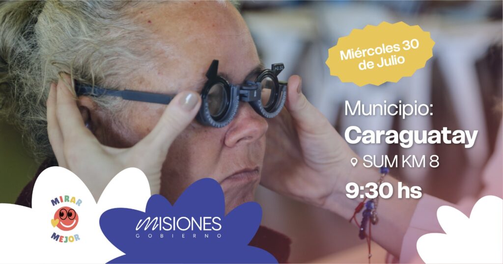 CARAGUATAY, MARTES 29 DE JULIO DE 2025 – El programa provincial “Mirar Mejor” continúa su recorrido por Misiones y este miércoles 30 de julio estará en Caraguatay. El operativo se desarrollará desde las 9:30 hs., en el Salón de Usos Múltiples (S.U.M) ubicado en el Kilómetro 8, de dicha localidad.