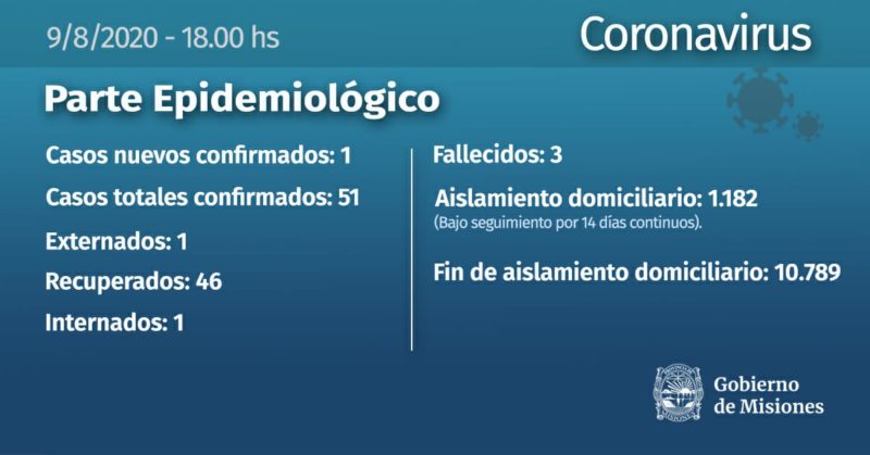 El Ministerio de Salud de Misiones informo en el ultimo parte epimediologico de un nuevo caso positivo de covid-19 una mujer de 60 años de edad de Comandante Andresito.