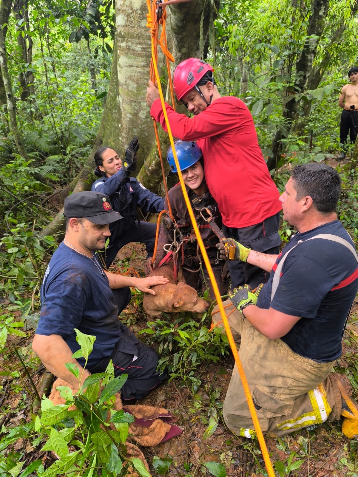 De inmediato se desplazó al lugar el Grupo GERSI, acompañado por personal de Bomberos. El hecho ocurrió en un hotel en construcción, donde un cuidador de aproximadamente 25 años observó que un perro había caído a un pozo de unos 17 metros de profundidad. En su intento por rescatarlo utilizando cables, el joven también terminó cayendo. Un segundo cuidador presente dio aviso inmediato a los Bomberos.