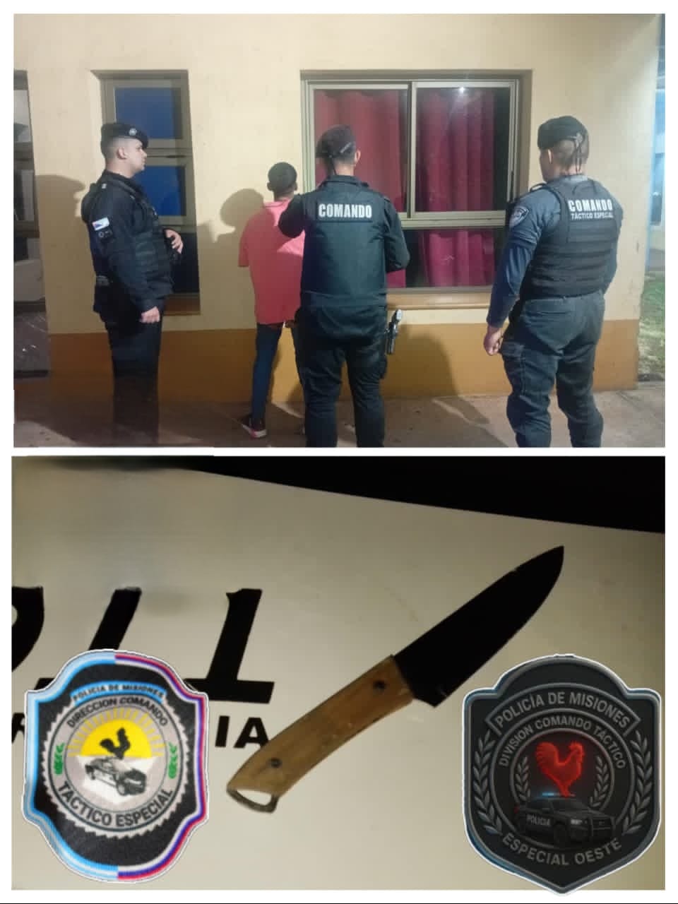 Minutos después, en la intersección de la calle Esperanza y la avenida San Martín, en la chacra 181, lograron localizar y detener al implicado, identificado como Cristian Ezequiel A.. Durante el procedimiento, los efectivos secuestraron un cuchillo tipo carnicero, que el sospechoso llevaba oculto entre sus prendas.