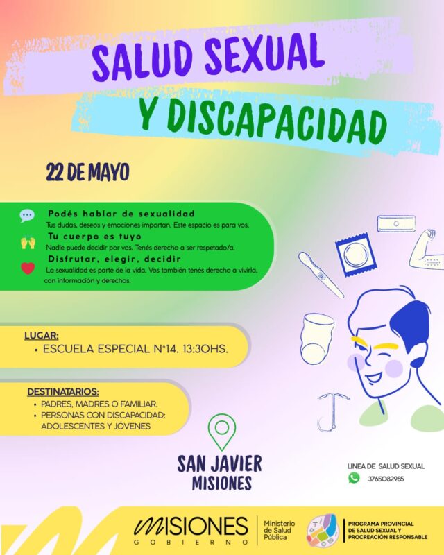 De esta manera, el miércoles 22 de mayo a las 13:30 horas, se realizará una jornada sobre salud sexual y discapacidad en la Escuela Especial N.º 14 de San Javier. La actividad está destinada a padres, madres, familiares, adolescentes, jóvenes y personas con discapacidad. El encuentro busca fomentar el conocimiento y ejercicio de los derechos sexuales y reproductivos, promoviendo una educación sexual integral adaptada y respetuosa de la diversidad funcional.