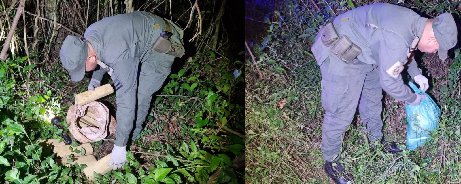 Asimismo, y en una operación de similares características, integrantes del ESCUADRÓN 11 “SAN IGNACIO” recorrían las afueras de la localidad de General Urquiza, donde hallaron dos bultos separados por escasos metros. Dentro del primero, una bolsa de arpillera, se contabilizaron 15 paquetes rectangulares que contenían una sustancia vegetal compacta, mientras que el segundo, una bolsa plástica, albergaba cogollos vegetales.