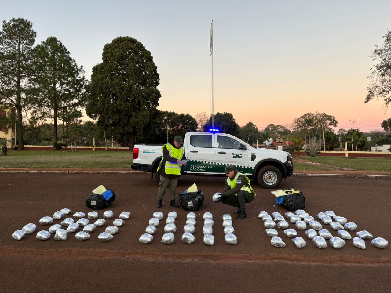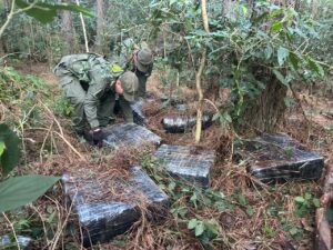 En ese contexto, una de las patrullas observó a una persona de sexo masculino que se adentró en una zona boscosa, en adyacencias a la Ruta Nacional Nº 12, al percatarse de la presencia del móvil de la Fuerza. Ante tal situación, el personal rastrilló la zona, lo que permitió hallar 30 bultos de grandes dimensiones que desprendían un fuerte olor similar al de la marihuana, así como una mochila. Dentro de los mismos se encontraban acondicionados 1.455 paquetes rectangulares con una sustancia vegetal.