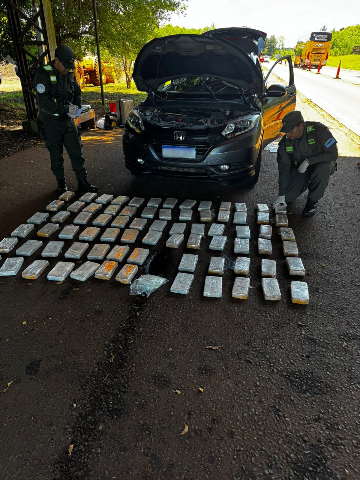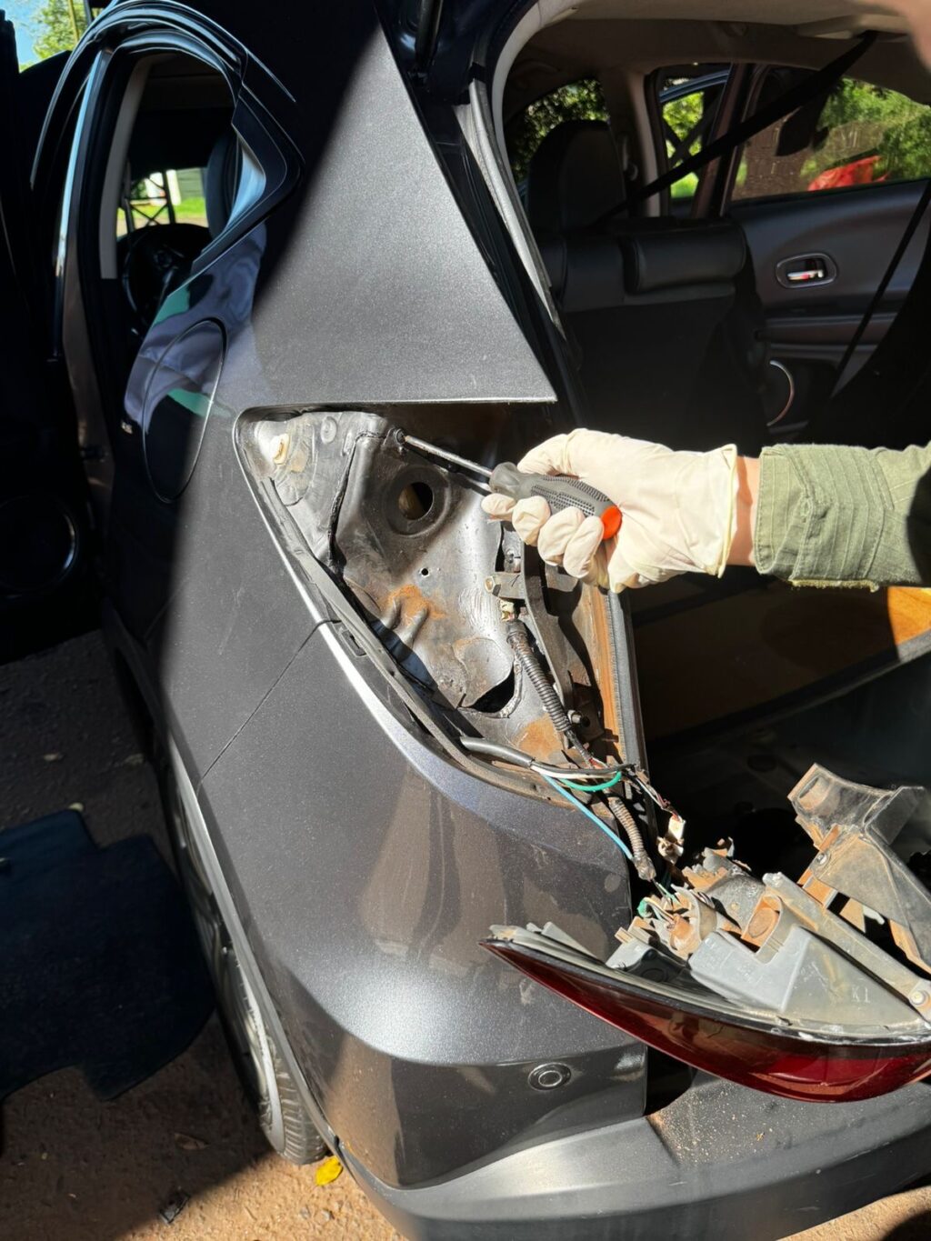 En ese contexto, integrantes de la SECCIÓN “URUGUA-Í”, ubicados sobre el kilómetro 1.606 del corredor vial, detuvieron la marcha de una camioneta tipo SUV con dominio brasilero. A bordo se trasladaba una pareja de la misma nacionalidad, ambos mayores de edad. Conforme el control físico del rodado avanzaba, los uniformados se percataron de distintas anomalías sobre la parte trasera de la carrocería.