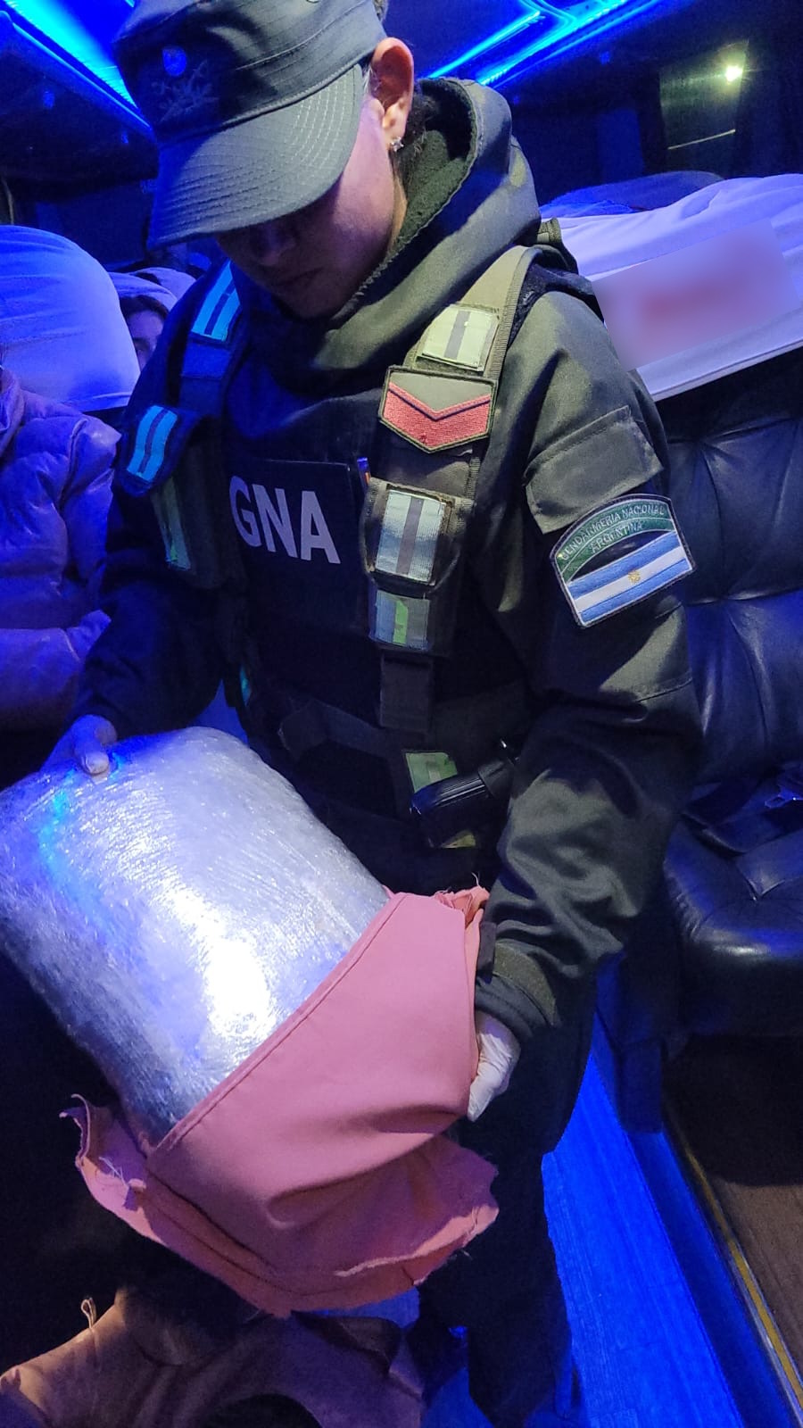 Durante la requisa de la unidad, el can detector de narcóticos “Sonic” brindó apoyo a las actividades y señaló las pertenencias de una ciudadana mayor de edad. En el interior de un equipaje de mano los uniformados constataron la presencia de un paquete envuelto en plástico que contenía cogollos vegetales.