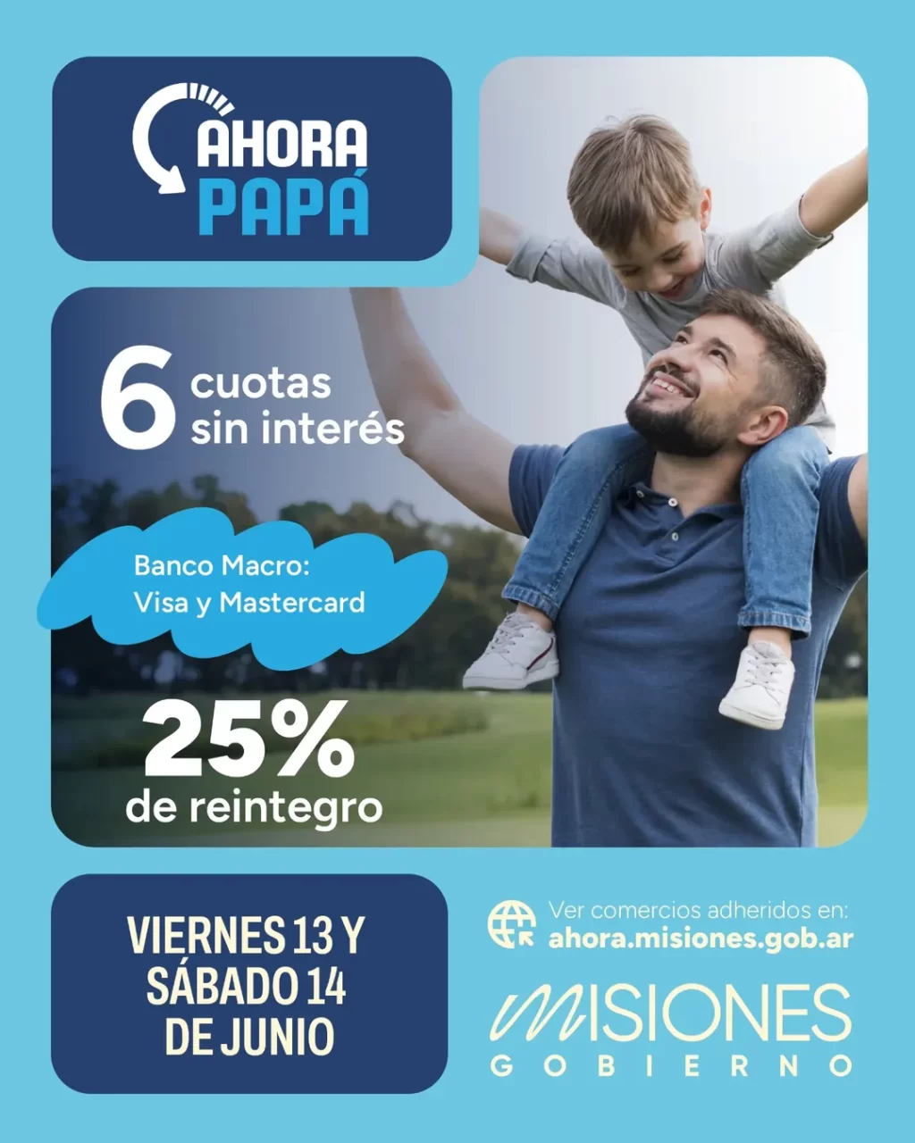 La nueva edición del programa “Ahora Papá” se implementará los días viernes 13 y sábado 14 de junio. El beneficio contempla hasta seis cuotas sin interés y reintegros de hasta el 25% con tarjetas del Banco Macro, con el objetivo de estimular las ventas por el Día del Padre y ofrecer mejores condiciones de compra a las familias misioneras.