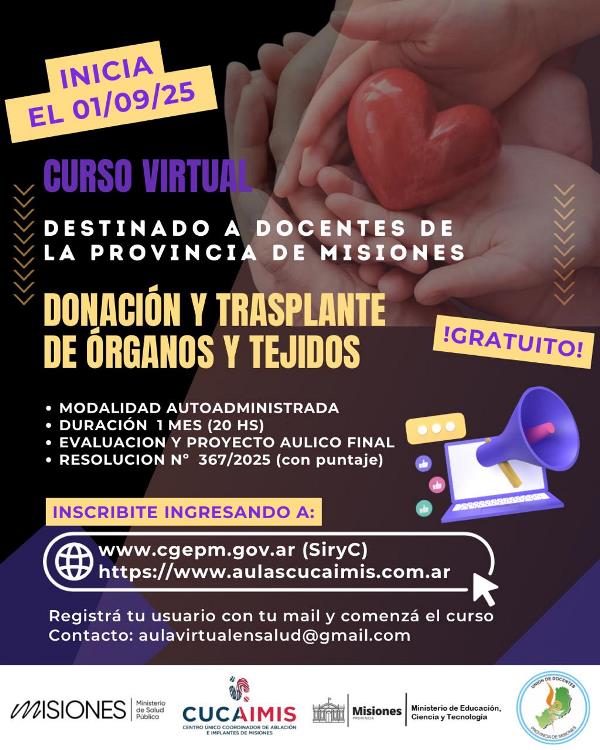Mañana, a partir de las 8 horas, se llevará a cabo en la sede de la Unión de Docentes de la Provincia de Misiones (UDPM) la presentación oficial del curso virtual de capacitación docente en donacion y trasplante de órganos y tejidos.