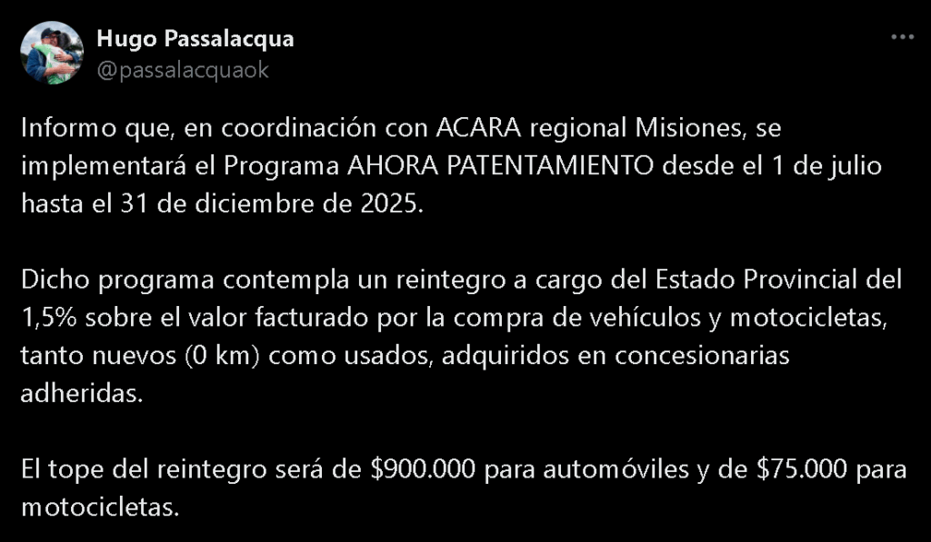 “Informo que, en coordinación con ACARA regional Misiones, se implementará el Programa AHORA PATENTAMIENTO desde el 1 de julio hasta el 31 de diciembre de 2025”, publicó el gobernador en su cuenta de X, plataforma desde la cual también compartió los alcances del beneficio.