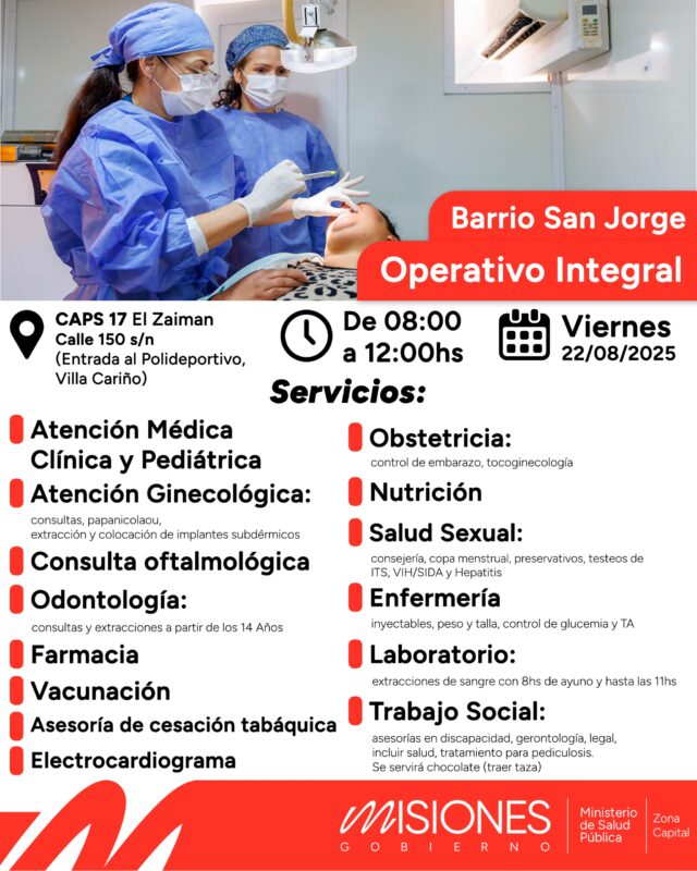 Este viernes 22, los equipos del Ministerio de Salud Pública estarán brindando una nueva jornada de atención integral en el CAPS 17 del barrio San Jorge de Posadas, de 8 a 12 horas.