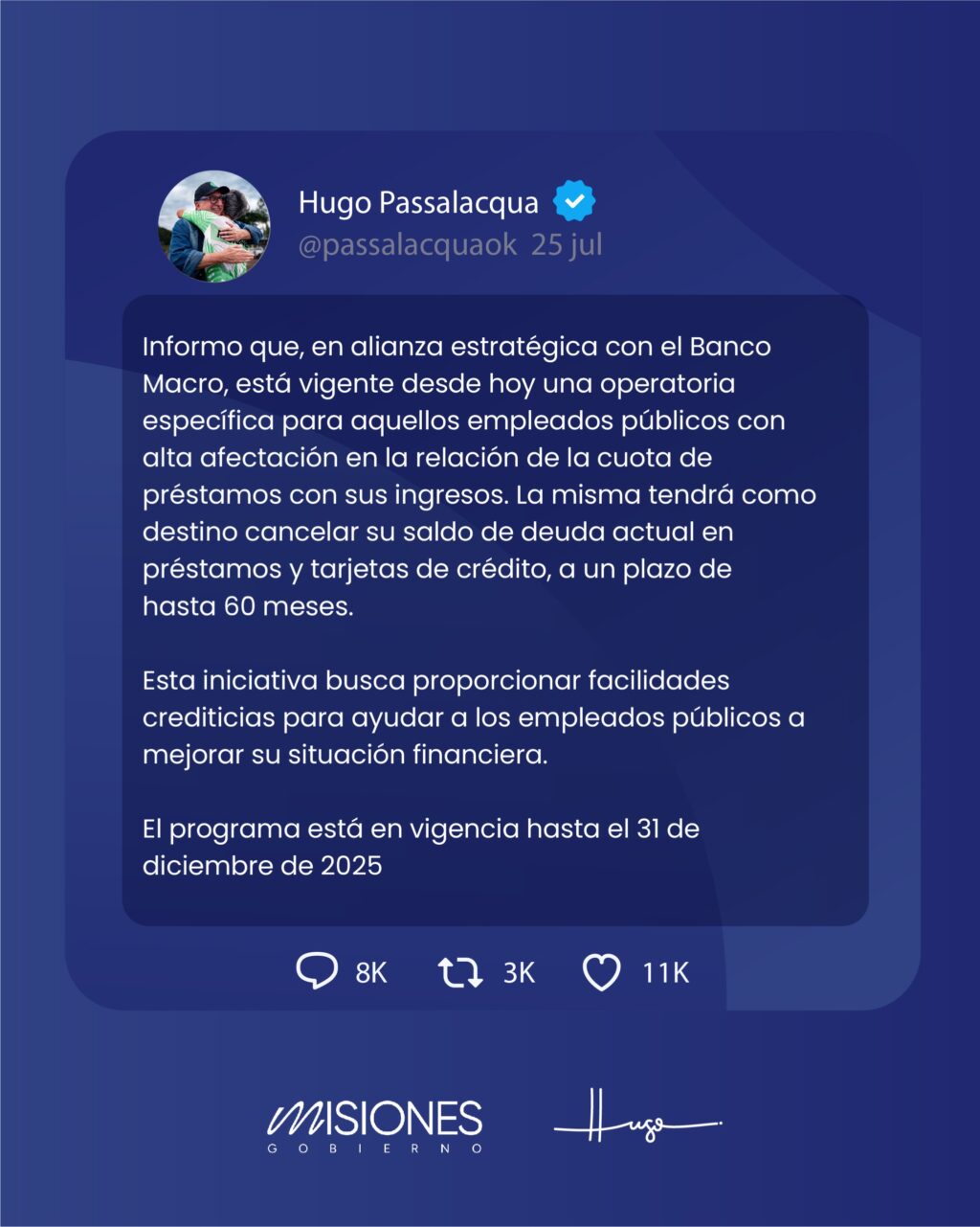 POSADAS, VIERNES 1 DE AGOSTO DE 2025. El gobernador Hugo Passalacqua comunicó este viernes, a través de sus redes sociales, la implementación de una operatoria crediticia especial para empleados públicos de la provincia que registran alta afectación en la relación cuota-ingreso. La iniciativa fue desarrollada de manera conjunta con el Banco Macro y apunta a facilitar la cancelación de deudas vigentes en préstamos y tarjetas de crédito.
