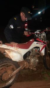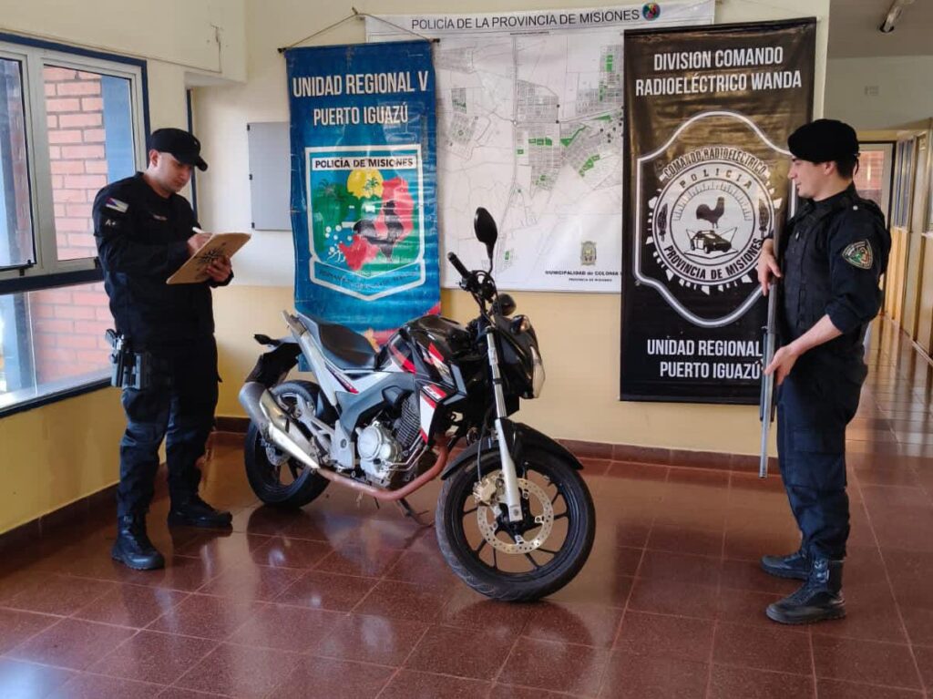 Finalmente, en Wanda, en el marco de investigaciones por el robo de una motocicleta Honda Twister denunciado horas antes, los efectivos tras un amplio rastrillaje localizaron en un camping de la zona la motocicleta que se encontraba oculta entre malezas. El rodado fue secuestrado y trasladado a la comisaría local.