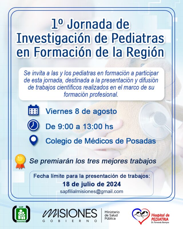 El próximo 8 de agosto se realizará la Primera Jornada de Investigación de Pediatras en Formación de la Región, en el Colegio de Médicos de Posadas, de 9 a 13 horas, organizada por la Sociedad Argentina de Pediatría y el Hospital de Pediatría Dr. Fernando Barreyro.