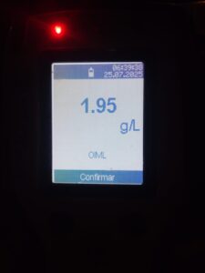 Tras realizarle el test de alcoholemia, se constató que el mismo presentaba 1,95 gramos de alcohol por litro en aire expirado, por lo que fue inmediatamente demorado y trasladado a sede policial.