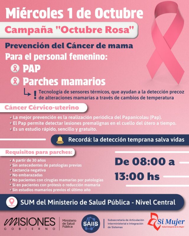 La actividad va a contar con la realización de tomas de muestras de PAP y colocación de parches mamarios. Para este último se debe tener en cuenta que el estudio se realiza a mujeres desde los 30 años, no deben tener patologías previas, no deben estar cursando un embarazo o estar lactando, no deben registrar cirugías mamarias por patología, las pacientes no deben tener prótesis, haberse realizado reducción mamaria o realizarse estudios previos al último año.