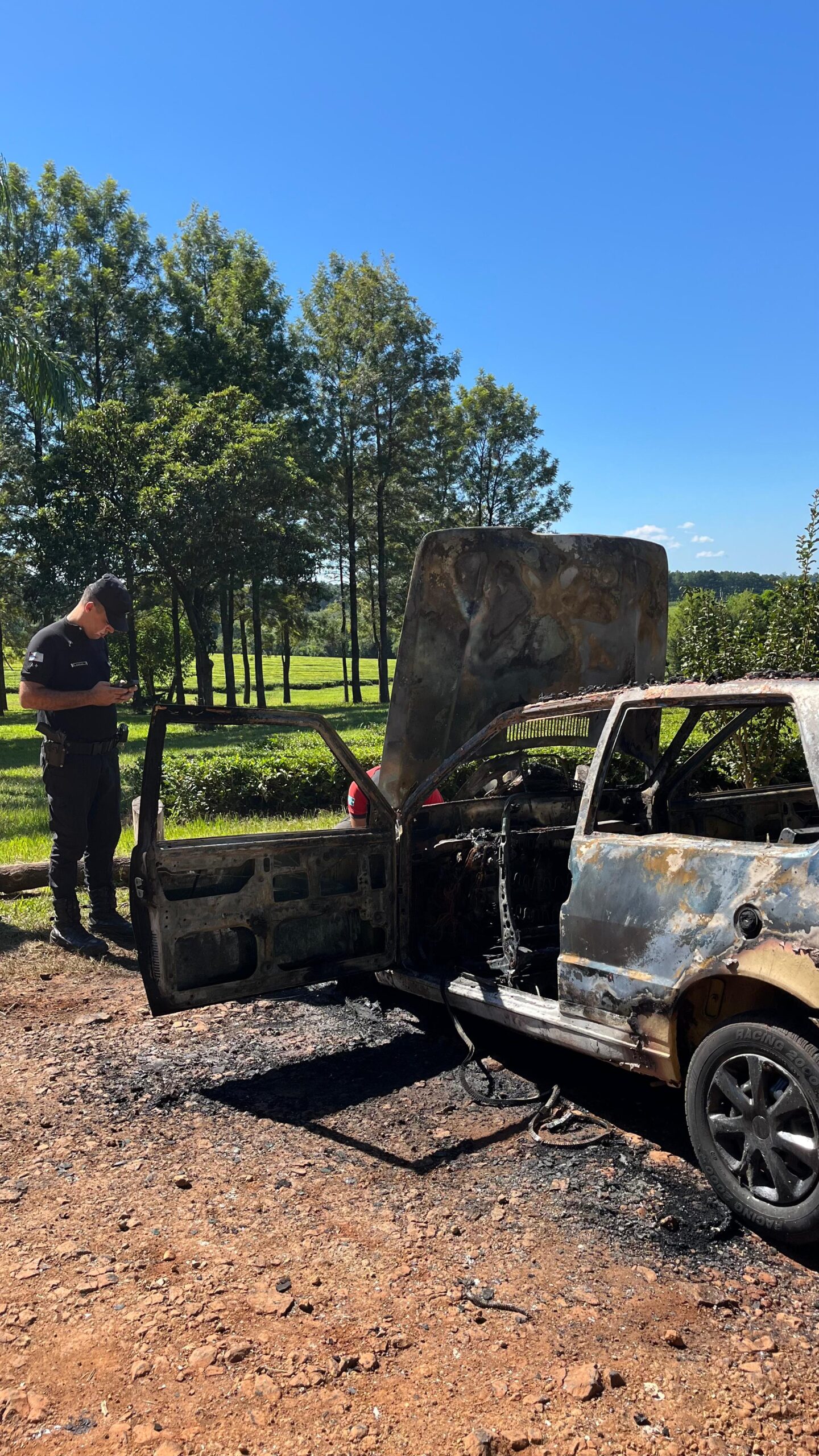 Cerca de las 10:45 horas sobre un camino vecinal terrado sin denominación, en la zona de Tayar, a la altura de la Ruta Provincial N° 7. Hasta el lugar acudieron efectivos de la Unidad Regional IX que trabajaron para sofocar el fuego que afectaba a un vehículo Fiat Uno.
