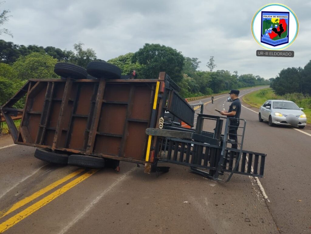 Esta mañana, un tráiler que transportaba una máquina vial volcó sobre la calzada en el kilómetro 1557 de la Ruta Nacional N° 12, en el paraje Pareha, jurisdicción de la Comisaría de Victoria. El tráiler era remolcado por una camioneta, y el siniestro no dejó personas lesionadas.